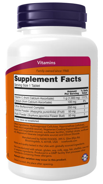 Supplement FactsServing Size:1 TabletServings Per Container:90DescriptionAmount per Serving% Daily ValueVitamin C (from Calcium Ascorbate) 1 g (1,000 mg) 1111% Calcium (from Calcium Ascorbate) 100 mg 8% Citrus Bioflavonoid Complex 250 mg † Daily Value not established. Acerola Powder (Malpighia punicifolia) (Fruit) 50 mg † Daily Value not established. Rutin Powder (Sophora japonica) (Flower Bud) 50 mg † Daily Value not established. †Daily Value not established.Other Ingredients: Hydroxypropyl Cellulose, Hypromellose (cellulose), Stearic Acid (vegetable source), Vegetarian Coating [hypromellose (cellulose), stearic acid (vegetable source), sunflower lecithin, triethyl citrate, sunflower oil], Magnesium Stearate (vegetable source) and Silicon Dioxide. Not manufactured with wheat, gluten, soy, milk, egg, fish, shellfish, tree nut or sesame ingredients. Produced in a GMP facility that processes other ingredients containing these allergens. Caution: For adults only. Consult physician if pregnant/nursing, taking medication, or have a medical condition. Keep out of reach of children. Natural color variation may occur in this product. Made and quality tested in the USA with globally sourced ingredients. Store in a cool, dry place after opening. Family owned since 1968. This bottle is made from 100% PCR (post-consumer recycled) resin.