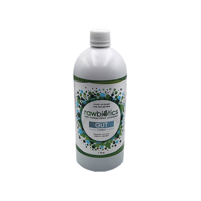 Rawbiotics GUT CORRECT is a live liquid probiotic specifically formulated to address microbial imbalances that contribute to various digestive disorders. It features herbal extracts such as Slippery Elm, Lemon Balm, Peppermint, and Rose Hip in its fermentation process, making it suitable for individuals with sensitive or compromised digestive systems. This probiotic aims to promote better gut health and alleviate digestive concerns. BENEFITS : Contains Herbal Extracts that work with the live probiotics to address the cause of digestive issues and restore long-term healthy balance to the gastro-intestinal tract Rawbiotics contain 14 strains and multiple classes of beneficial live bacteria fermented at body temperature As a result, and unlike pure-culture (freeze-dried) probiotics, Rawbiotics create a comprehensive probiotic that better survives stomach acid Improves the body’s ability to digest food, use nutrition, and stay healthy