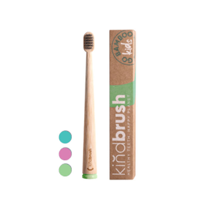 Encourage eco-conscious oral care in your little superhero with the Kindbrush Kids Bamboo Toothbrush. Featuring a small head for reaching those tricky spots, fine charcoal-infused nylon bristles for thorough plaque removal, and an ergonomically designed bamboo handle for a comfortable grip. This toothbrush is biodegradable, water-resistant, antibacterial, and antifungal. Its convenient flat bottom ensures it stands securely and stays hygienic. Let your child choose from three delightful colors – aqua, pink, or mint, making oral hygiene an eco-friendly adventure. Support their dental health and environmental sustainability with this eco-conscious toothbrush for kids.